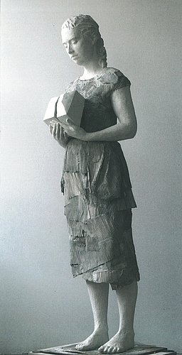 Sie hält ein kleines Klostergebäude in ihren Händen, behutsam, ja liebevoll, auf Herzhöhe. Das kleine Haus symbolisiert ihre Gemeinschaft. Sie hält es sehr vorsichtig, denn sie weiß, das ist Gabe und Aufgabe, Geschenk und Auftrag des Herrn an sie. Geschenk, das sehr kostbar, aber auch sehr zerbrechlich ist. Der Riss, der durch das Gebäude geht, der Bruch, ist unübersehbar. Sie trägt es wie ein geliebtes Kind, um das sie sich sorgt und mit dem sie leidet.
